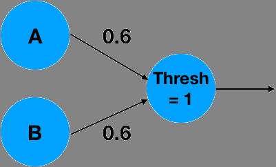 It is easy to see that for A=0, B=0, the linear combination 0*0.6 + 0*0.6 = 0, which is less than the threshold of 1 and will result in a 0 output. With an input A=0, B=1 or A=1, B=0 the linear combination will results in 1*0.6 + 0*0.6 = 0.6, which is less than 1 and result in a 0 output. Similarly, A=1, B=1 will result in 1*0.6+1*0.6=1.2, which is greater than the threshold and will result in a 1 output! What is interesting is that the simple neuron operation can also be described as an inner product between the vector [A,B]^T and the weights vector [0.6,0.6]^T followed by as thresholding, non-linear operation.